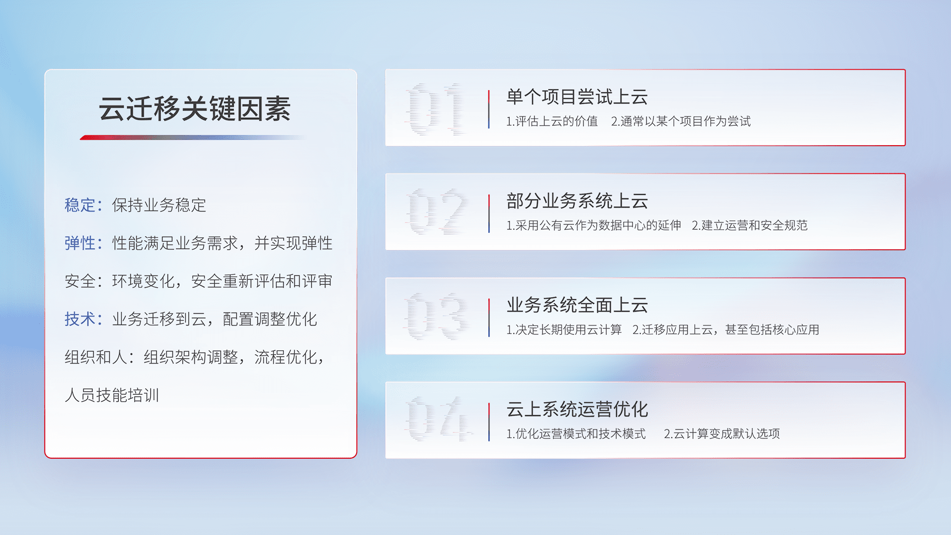 结合实际业务,,从规划设计、、云平台选型、、、、云原生改造、、数据迁移、、、集成交付,,,,迁移全过程为客户识别最佳上云路径,,,做好风险识别管理,,设计网络架构、、、身份权限、、、、安全审计合规、、操作审计、、、、日志审计、、、监控告警策略、、、多站点容灾设计等,,对云上基础设施进行整体规划,,,提升IT治理水平,,,,以满足弹性、、高可用、、、、高性能的需求。。。